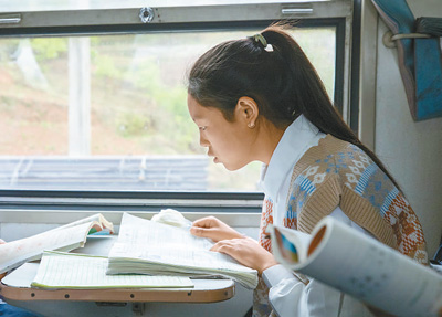一名学生在乘坐成昆铁路5633次列车途中复习功课。