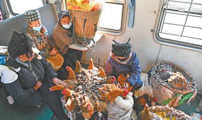 一列火车从四川普雄开往攀枝花,沿线停靠时,附近村民将家禽等农副产品带上车,赶往县城售卖。
