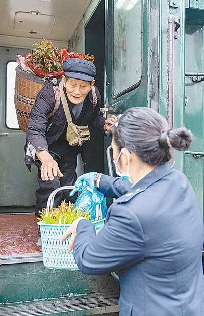 在位于湖南怀化的谷达坡站,乘务员为乘客递蔬菜。
