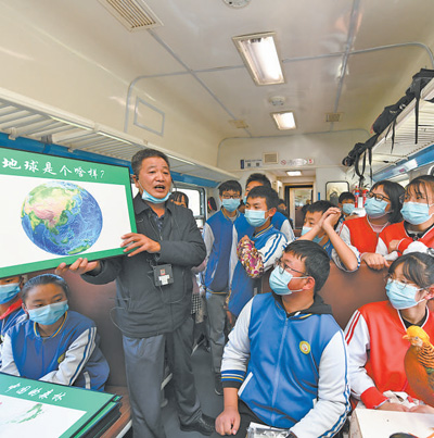 在由四川广元开往陕西宝鸡的6064次“秦岭小慢车”上,一名教师在为沿线通勤的学生们公益授课。
