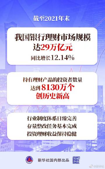 【#权威快报#|#我国银行理财市场规模达29万亿元#】银行业理财登记托管中心26日发布的报告显示,截至2021年末,我国银行理财市场规模达29万亿元,同比增长12.14%;持有理财产品的投资者数量达到8130万个,创历史新高。在资管行业打破刚性兑付的背景下,银行理财实现了较为平稳的产品收益,2021年累计为投资者创造收益近1万亿元,成为百姓打理“钱袋子”的重要渠道。(记者李延霞)