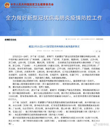【#2月25日新增确诊病例249例# #2月25日新增本土病例93例#】据国家卫健委官网消息,2月25日0—24时,31个省(自治区、直辖市)和新疆生产建设兵团报告新增确诊病例249例。其中境外输入病例156例(广东59例,上海55例,广西7例,天津6例,福建6例,云南6例,北京4例,浙江4例,山东4例,江苏2例,重庆2例,甘肃1例),含30例由无症状感染者转为确诊病例(广东22例,浙江4例,广西4例);本土病例93例(内蒙古32例,其中呼和浩特市30例、呼伦贝尔市2例;广东30例,其中东莞市19例、深圳市9例、珠海市2例;辽宁10例,均在葫芦岛市;广西9例,均在防城港市;江苏4例,均在苏州市;云南3例,其中临沧市2例、红河哈尼族彝族自治州1例;四川2例,均在成都市;北京1例,在朝阳区;黑龙江1例,在鸡西市;福建1例,在厦门市),含1例由无症状感染者转为确诊病例(在江苏)。无新增死亡病例。无新增疑似病例。