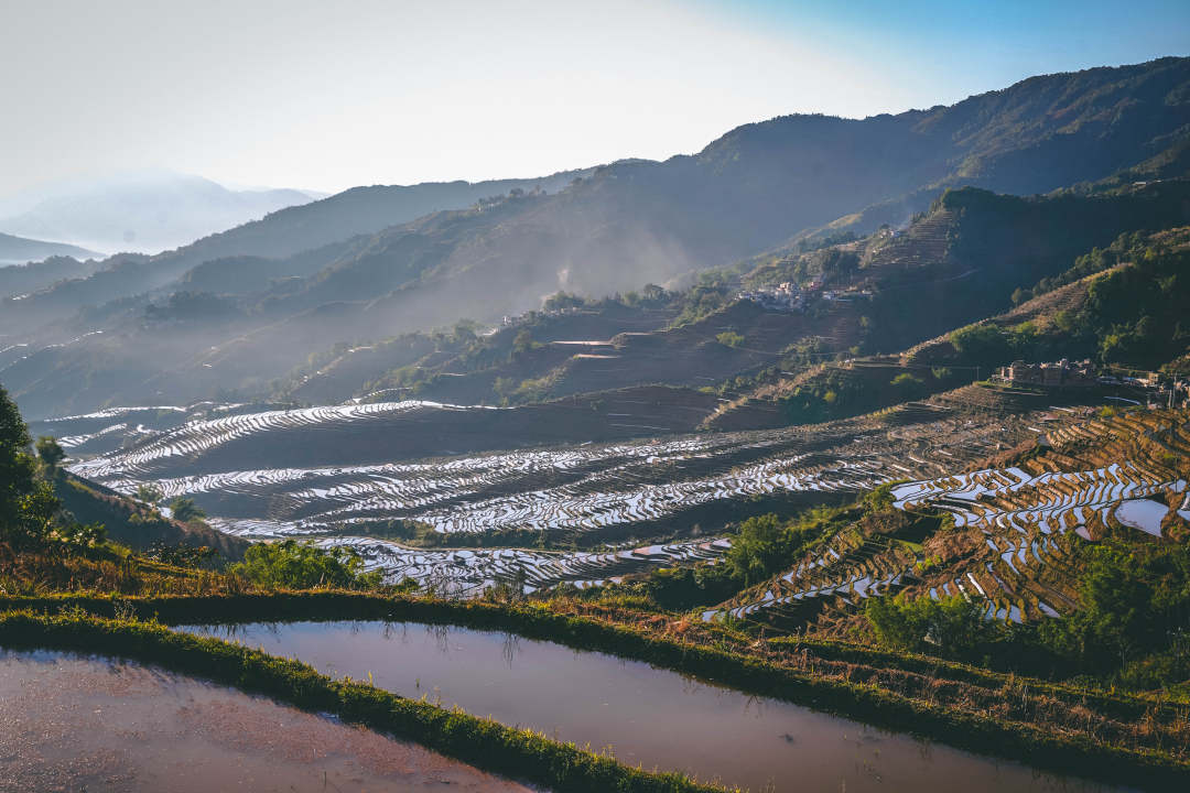 2月23日清晨,金黄金黄的太阳懒懒的爬上了东边的山头,初春的哀牢山被照射得终于睁开了眼,薄雾间层层叠叠的“镜子”也扯下了神秘的面纱。