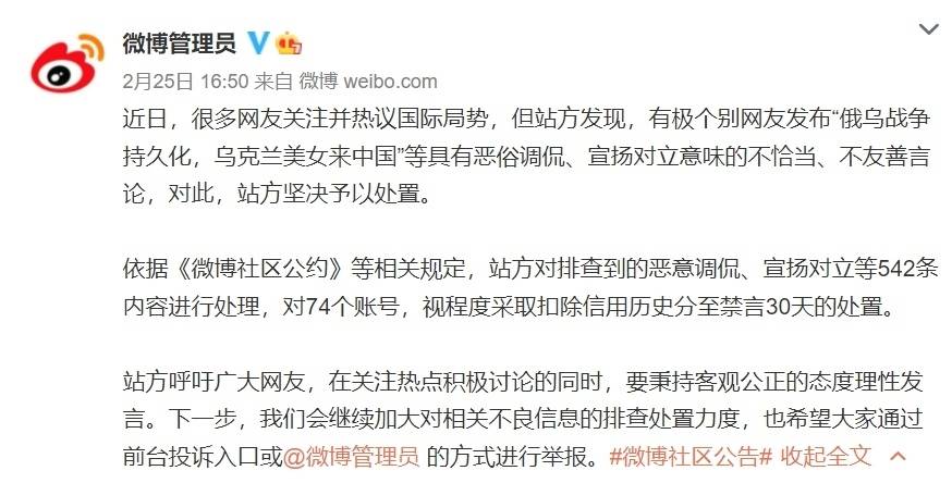 依据《微博社区公约》等相关规定,站方对排查到的恶意调侃、宣扬对立等542条内容进行处理,对74个账号,视程度采取扣除信用历史分至禁言30天的处置。