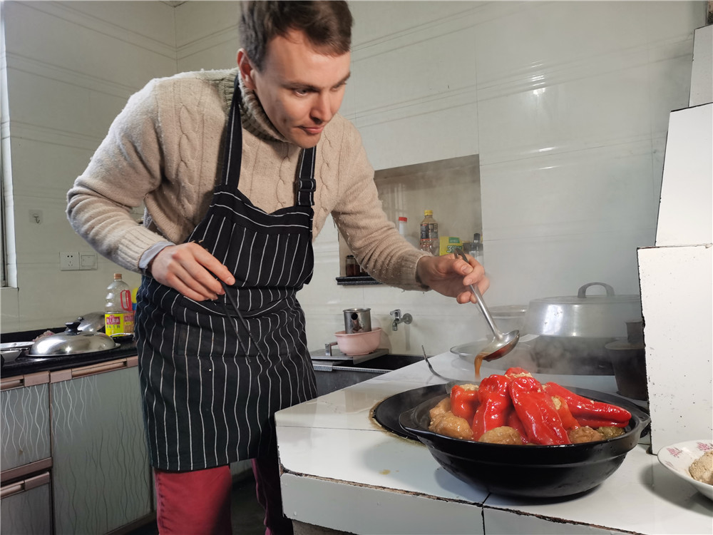 在当地村民汪琳的家里,卓文跟她学习掏辣椒籽、剁肉馅,试着烧柴火灶,忙得满头是汗。“做菜很有乐趣,特别是学习自己不会做的地方特色菜。”卓文说。