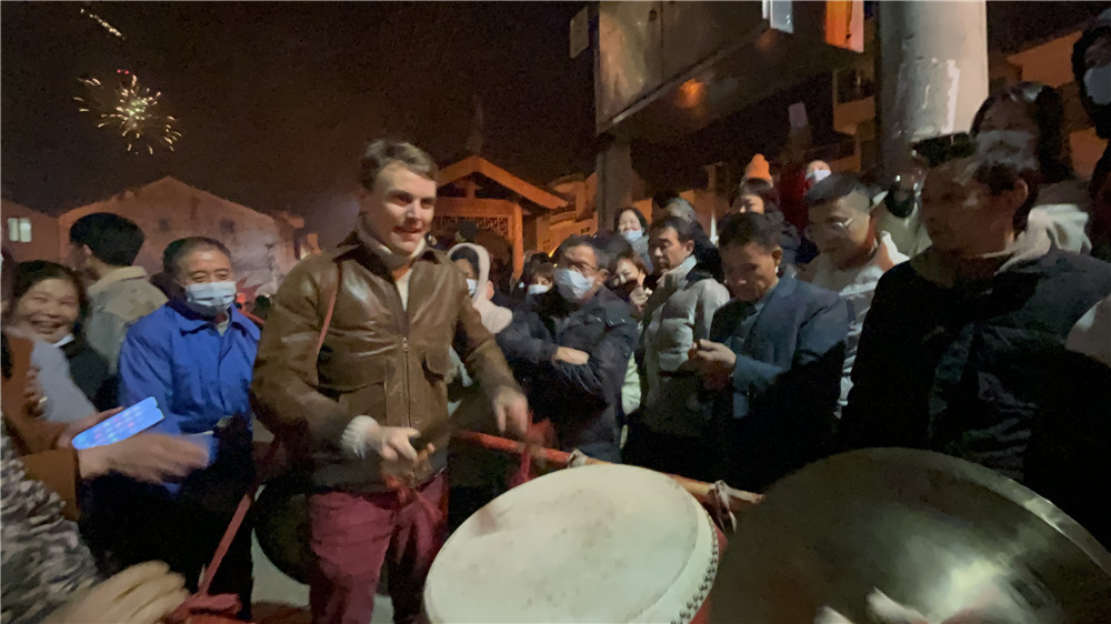 除了学做菜,他还在这里体验了当地的民俗活动“汪满田嬉鱼灯”。晚上九点多钟,村庄里热闹非凡,大小鱼灯穿梭。熙攘的人群中,卓文接过村民手中的鼓槌,开始敲鼓。