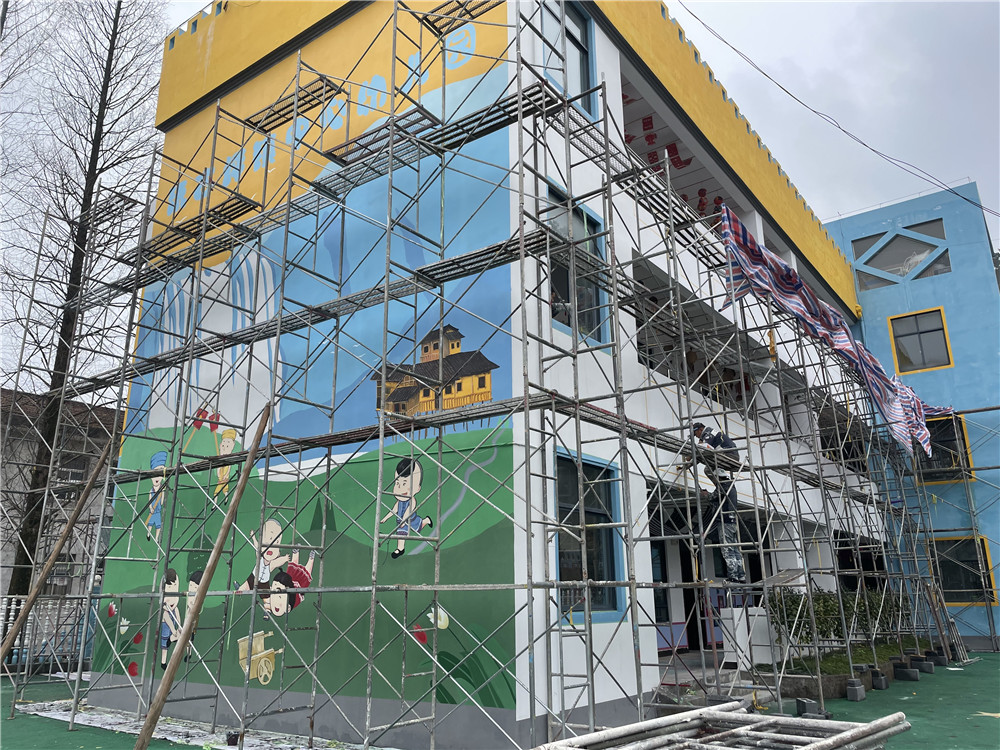 工作人员在粉刷湖南省张家界市沅古坪镇中心幼儿园的外墙(2022年2月12日摄)。新华社记者 张格 摄