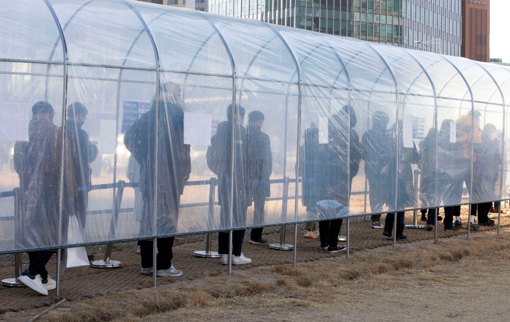 2月24日,人们在韩国首尔一处新冠病毒检测点排队等待检测。(新华社发,李相浩摄)