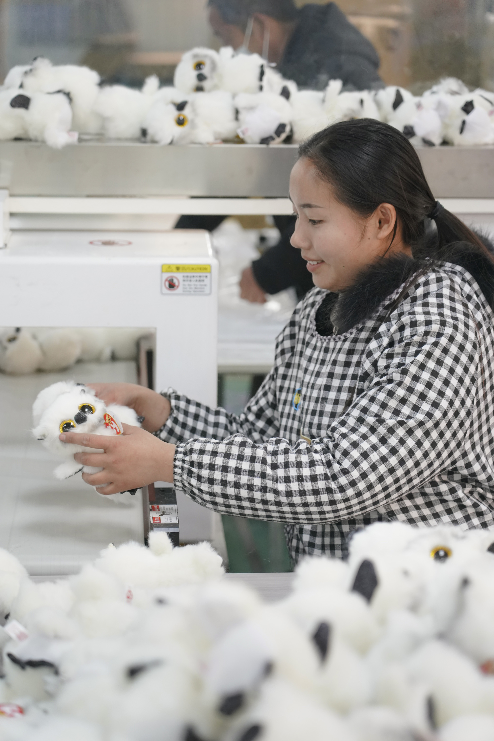 新华社照片,西安,2022年2月26日 秦巴山区千家“社区工厂”助力易地搬迁群众就业 2月22日,在安康市汉滨区五里镇朝阳社区一家毛绒玩具社区工厂内,一名工人在检验产品商标。 近年来,地处秦巴山区的陕西省安康市,坚持发展毛绒玩具、电子线束等产业的社区工厂,解决大量易地搬迁群众的就业。目前已建成在营社区工厂1023家,在厂就业人数31667人,其中脱贫人口8278人。 新华社记者 邵瑞 摄