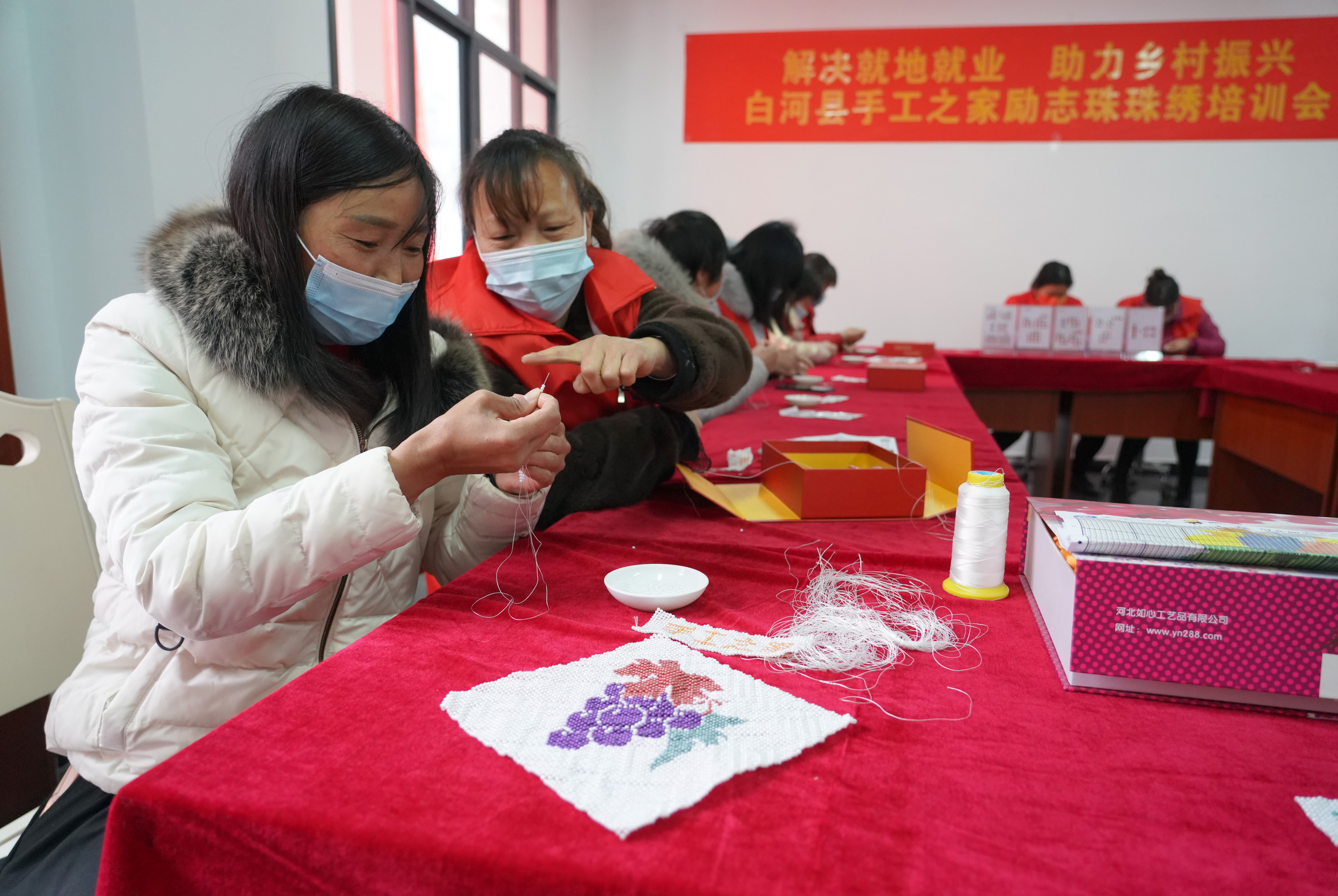 新华社照片,西安,2022年2月26日 秦巴山区千家“社区工厂”助力易地搬迁群众就业 2月22日,在安康市白河县中厂镇迎新社区一家手工制品社区工厂内,工人在制作珠绣产品。 近年来,地处秦巴山区的陕西省安康市,坚持发展毛绒玩具、电子线束等产业的社区工厂,解决大量易地搬迁群众的就业。目前已建成在营社区工厂1023家,在厂就业人数31667人,其中脱贫人口8278人。 新华社记者 邵瑞 摄