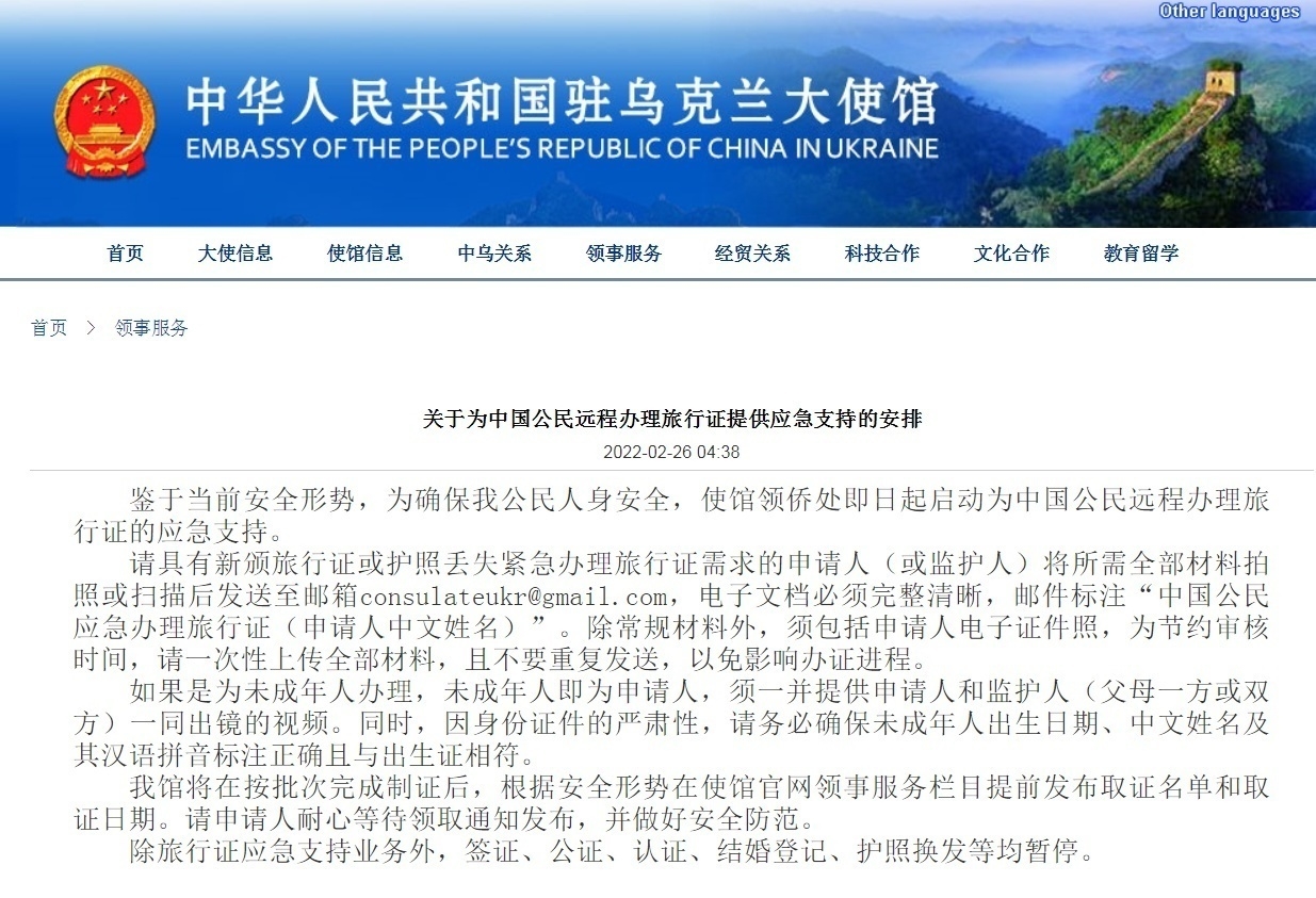 我驻乌克兰大使馆2月26日在其官网发布《关于为中国公民远程办理旅行证提供应急支持的安排》称,使馆领侨处即日起启动为中国公民远程办理旅行证的应急支持,并将在按批次完成制证后,根据安全形势在使馆官网领事服务栏目提前发布取证名单和取证日期。