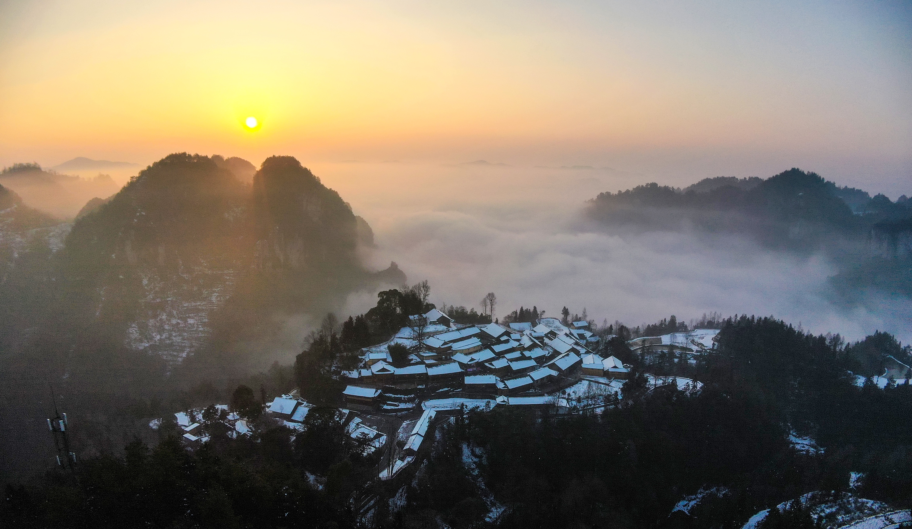 新华社照片,北京,2022年2月26日 日出美如画 2月24日早上拍摄的湖南省湘西土家族苗族自治州花垣县双龙镇十八洞村雪后日出(无人机照片)。 新华社发(龙恩泽摄)