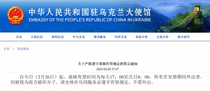 2月26日,中国驻乌克兰大使馆网站发布《关于严格遵守基辅宵禁规定的紧急通知》,自今日起,基辅宵禁时间为每天17:00至次日8:00。所有在宵禁期间外出者,均被视为敌方破坏分子。请全体在乌同胞务必遵守宵禁规定,不要外出。
