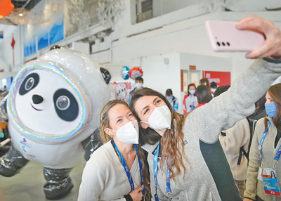 北京冬奥会举行期间,主媒体中心举办集体采访活动,现场观众与北京2022年冬奥会吉祥物“冰墩墩”自拍留念。 新华社记者 鞠焕宗摄 |