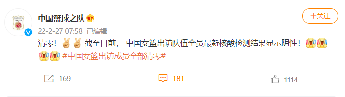 @中国篮球之队 微博27日消息,截至目前,中国女篮出访队伍全员最新核酸检测结果显示阴性。