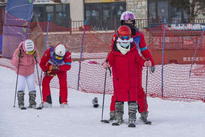 1月21日,在黑龙江省亚布力滑雪旅游度假区一处滑雪场,教练在教滑雪爱好者滑雪。新华社记者谢剑飞摄