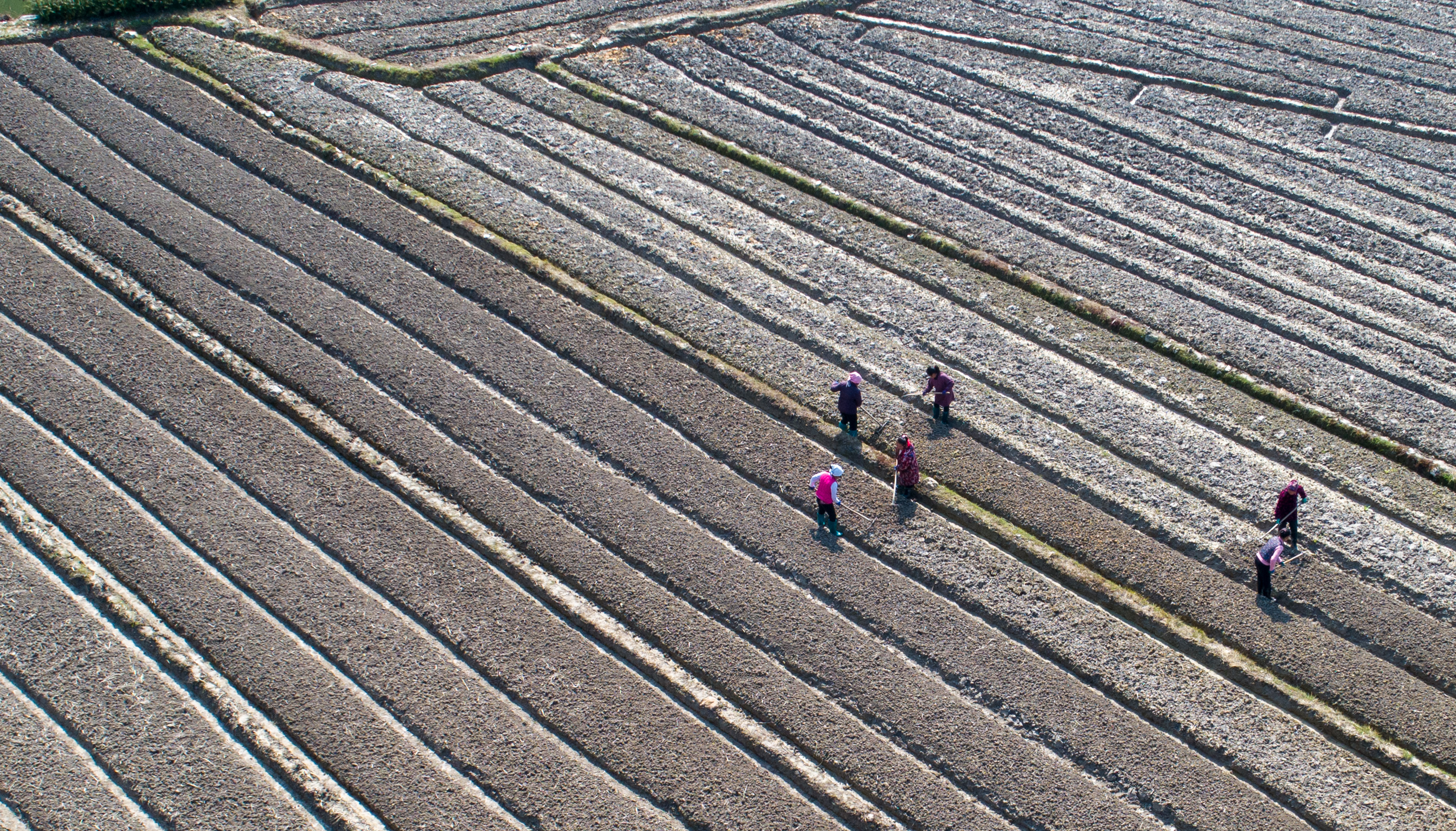 新华社照片,怀化(湖南),2022年2月27日 春忙在田间 2月27日,湖南省怀化市通道侗族自治县菁芜洲镇江口村村民在整理田地(无人机照片)。 近日,随着气温的升高,各地农民抢抓农时投入到农业生产之中,田间地头一派忙碌景象。 新华社发(粟勇主 摄)