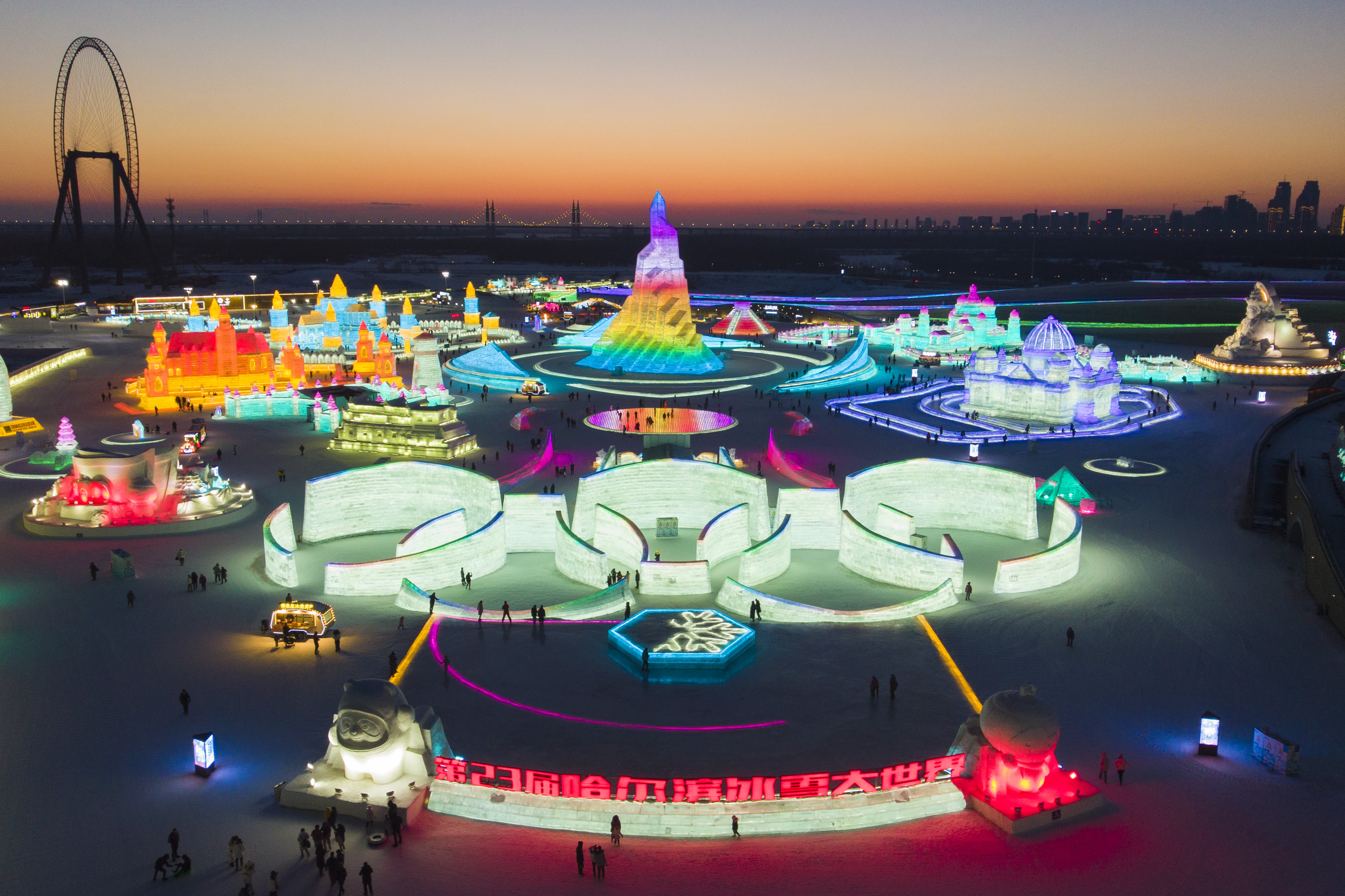 新华社照片,哈尔滨,2022年2月27日 哈尔滨冰雪大世界闭园 2月27日,游客在哈尔滨冰雪大世界园区游玩(无人机照片)。 当日是第二十三届哈尔滨冰雪大世界开园的最后一天,许多市民和游客来到这里游玩。 新华社记者 张涛 摄