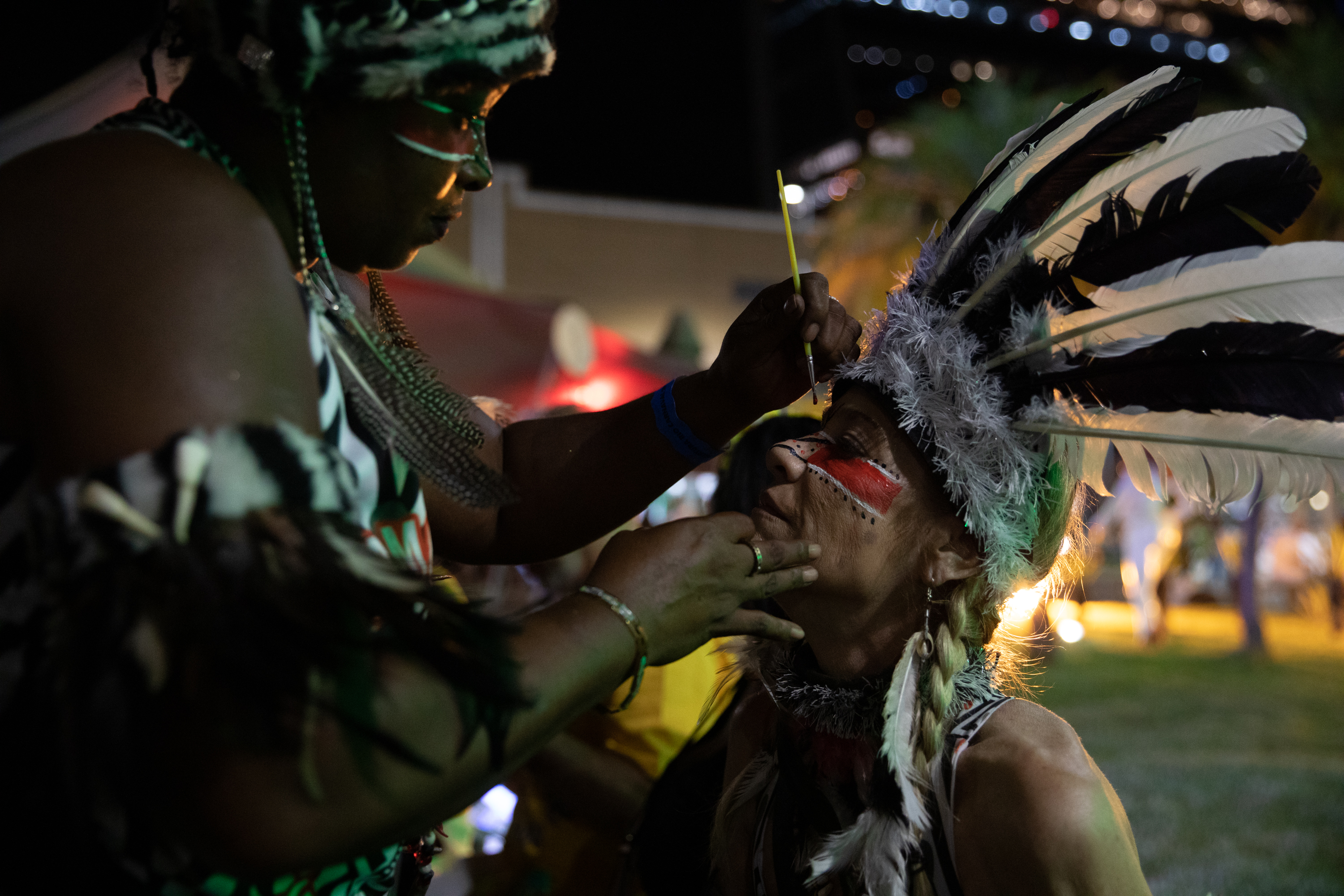 新华社照片,里约热内卢,2022年2月27日 (国际)(2)巴西:里约热内卢举行狂欢节假期庆祝活动 2月26日,两名表演者在巴西里约热内卢桑巴之城参加狂欢节假期庆祝活动时补妆。 当日,来自巴西里约热内卢桑巴之城的12所桑巴舞特级学校举行活动,庆祝狂欢节假期到来。2022年巴西的狂欢节假期为2月26日至3月1日。 新华社记者 王天聪 摄