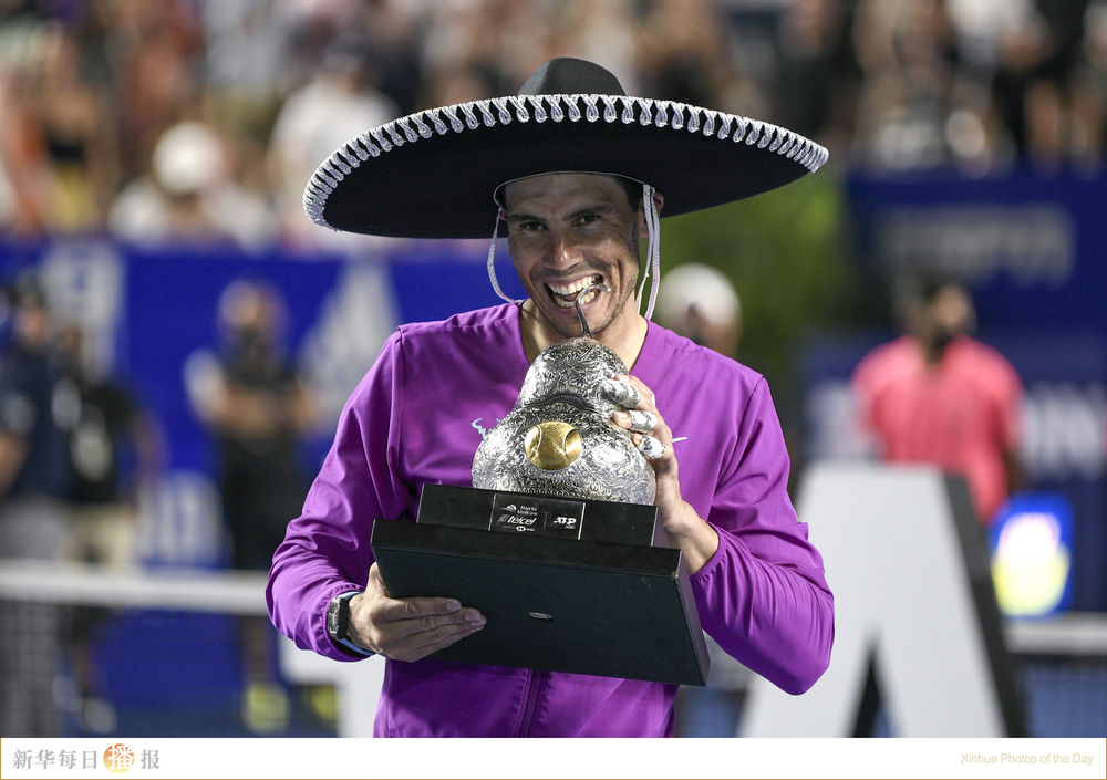 2月26日,在墨西哥阿卡普尔科进行的2022墨西哥网球公开赛男子单打决赛中,西班牙选手纳达尔以2比0战胜英国选手诺里,夺得冠军。这是纳达尔在颁奖典礼上展示奖杯。