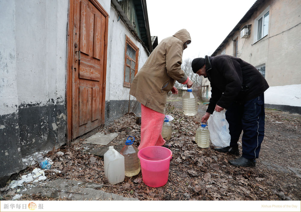 2月26日,顿涅茨克当地居民搬运水桶。新华社发(维克多摄)
