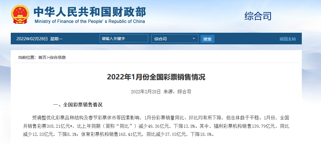 据财政部2月28日消息,受调整优化彩票品种结构及春节彩票休市等因素影响,1月份彩票销量同比、环比均有所下降,但总体趋于平稳。1月份,全国共销售彩票308.21亿元,比上年同期(简称“同比”)减少49.36亿元,下降13.8%。其中,福利彩票机构销售139.79亿元,同比减少12.33亿元,下降8.1%;体育彩票机构销售168.41亿元,同比减少37.03亿元,下降18.0%。