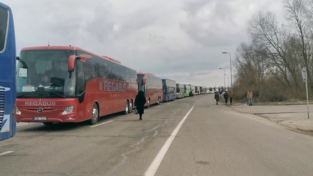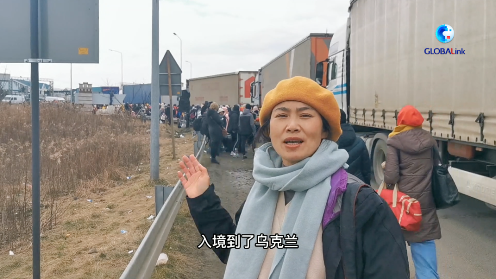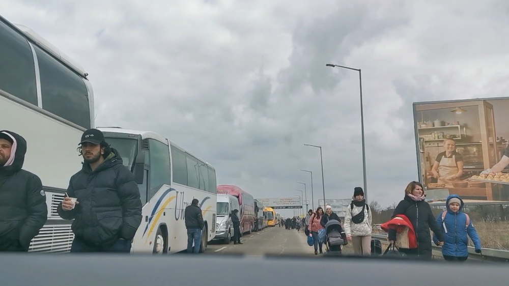 经过两名边防人员盘问和最后一道关卡后,我们终于进入乌克兰。首先映入眼帘的,是两条长长的队伍。公路右侧,是提着各式行李、面露疲态的人群;公路左侧,是一眼望不到头的车队。由于出境人数暴增,他们只能等待边检站一批批放行。一名乌边防军女军官说,最近三天她总共只睡了几个小时。