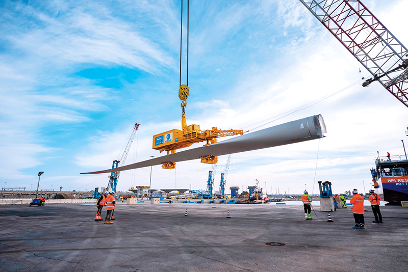2022年1月27日,在意大利南部海港塔兰托,中意两国施工人员吊装风电叶片。中国技术、国际合作助力意大利向着增加清洁能源、应对气候变化的目标又迈进了一步 保拉·萨拉帕摄/本刊