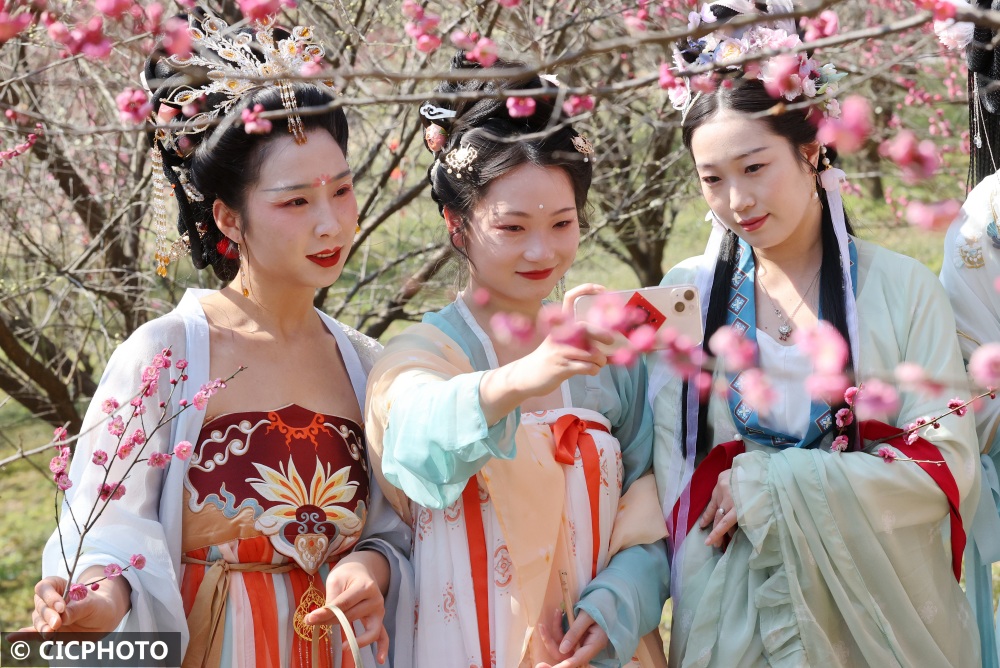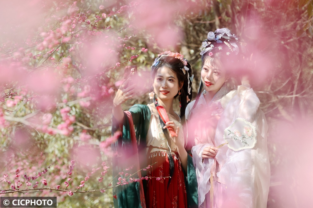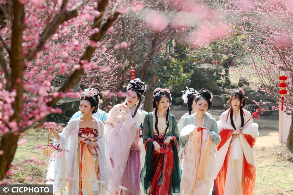 ↑2022年2月26日,身着传统服饰的游客在浙江省湖州市德清县下渚湖街道上杨村梅花园游玩赏花。CICOHOTO/谢尚国 摄