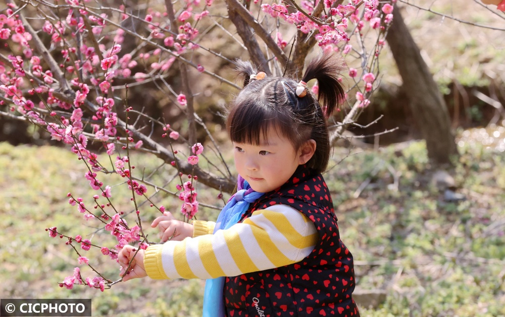 ↑2022年2月26日,小朋友在浙江省湖州市德清县下渚湖街道上杨村梅花园游玩赏花。CICOHOTO/谢尚国 摄