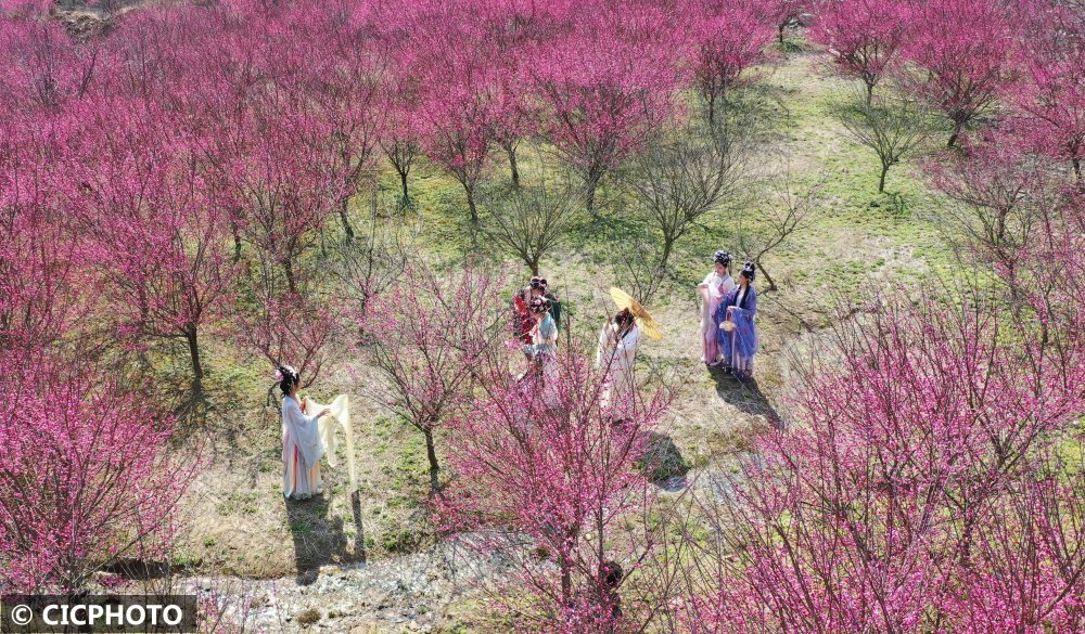 ↑2022年2月26日,身着传统服饰的游客在浙江省湖州市德清县下渚湖街道上杨村梅花园游玩赏花。(无人机照片)CICOHOTO/谢尚国 摄