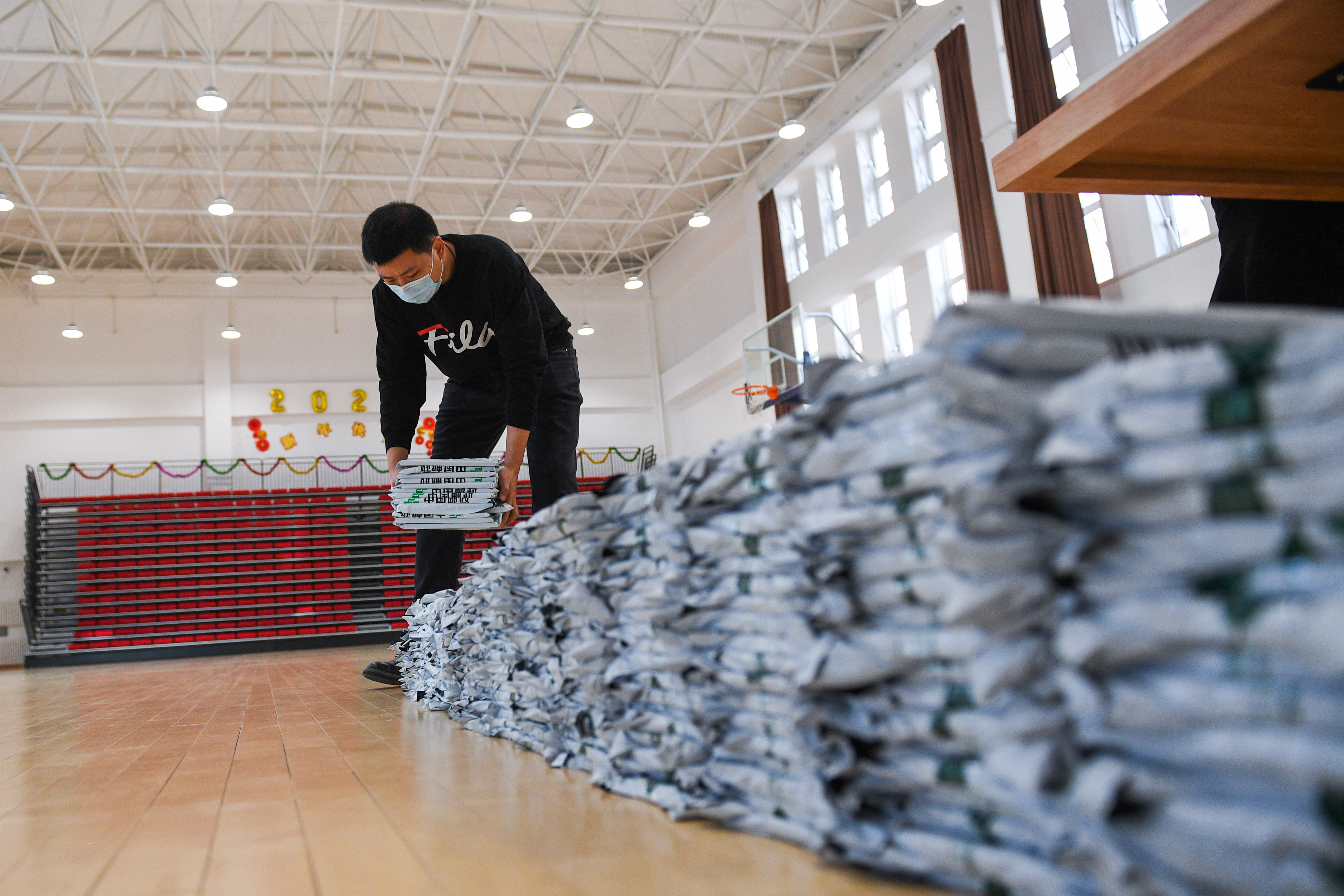 新华社照片,呼和浩特,2022年2月28日 呼和浩特:积极筹备“线上”开学 2月28日,在呼和浩特市赛罕区南门外小学,工作人员在堆放打包好的教材。 近日,内蒙古呼和浩特市赛罕区南门外小学(昭乌达南路分校)的教职工忙着打包教材快递、录制网课,迎接新学期的“线上”开学。受疫情影响,呼和浩特市中小学定于3月1日以线上教学模式如期开学。 新华社记者 刘磊 摄