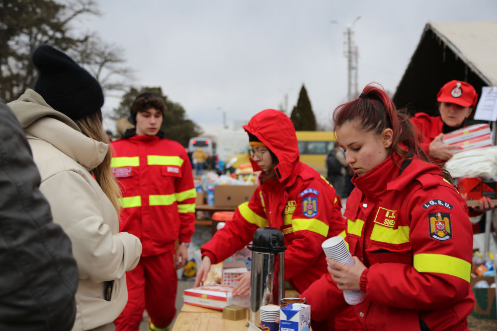 ↑2月27日,在罗马尼亚北部与乌克兰接壤的锡雷特,工作人员为入境的乌克兰民众提供热饮。新华社记者 林惠芬 摄