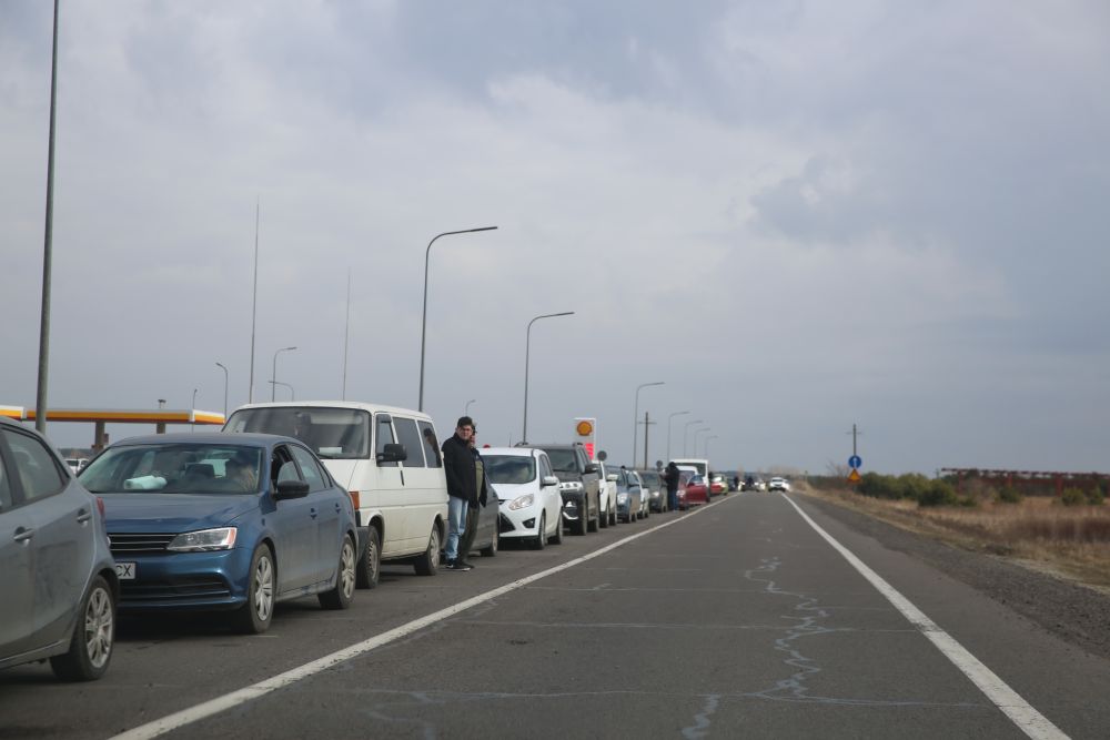 ↑2月27日,在乌克兰克拉科韦茨,车辆排队等待前往波兰方向。新华社记者 陈文仙 摄