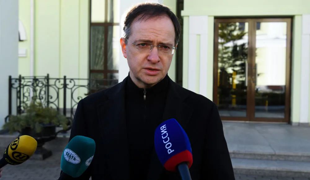 2月28日,俄罗斯代表团团长梅金斯基在白俄罗斯戈梅利州接受媒体采访。新华社/卫星社