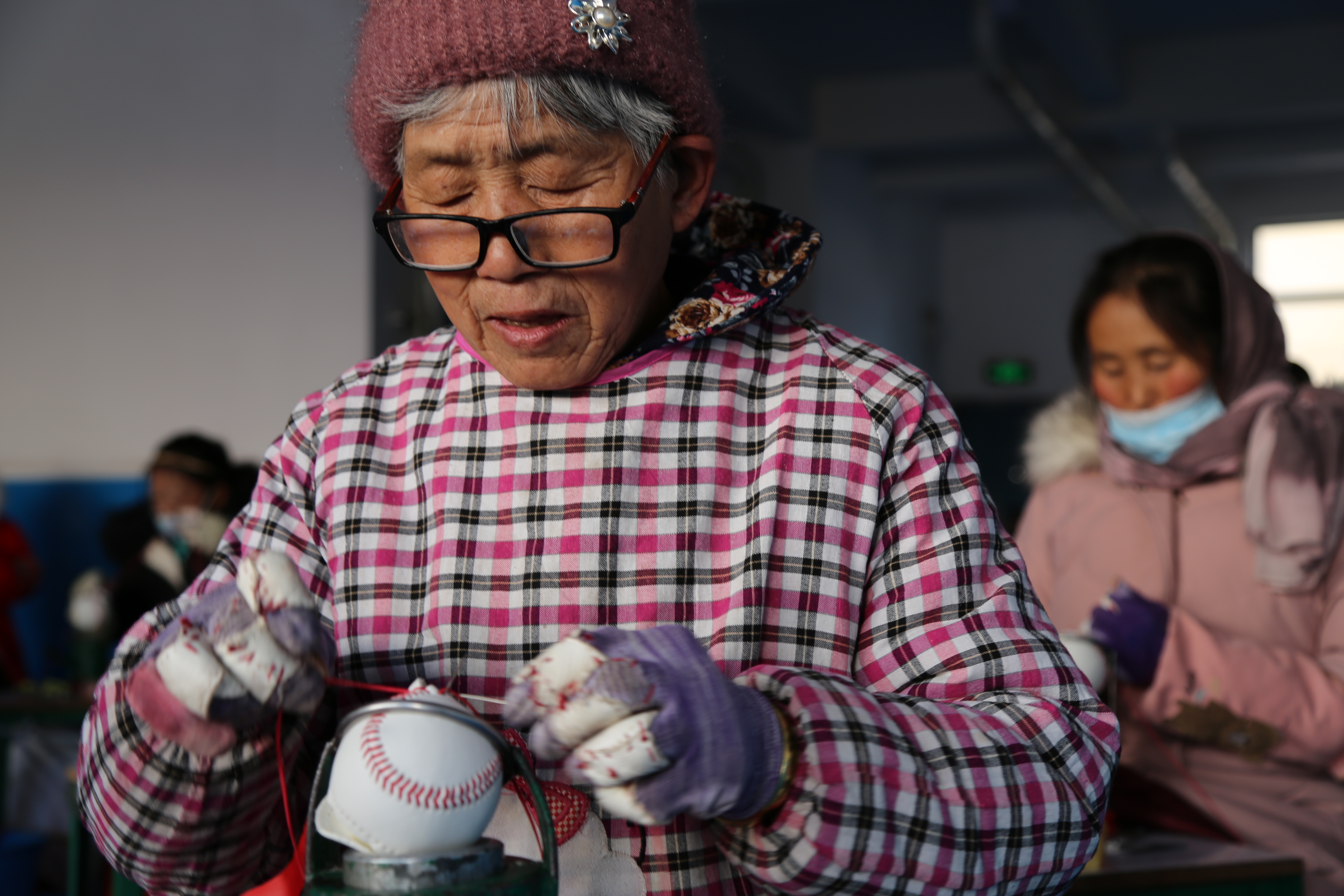 云南会泽县搬迁群众正在制作棒球。(李荣山摄)
