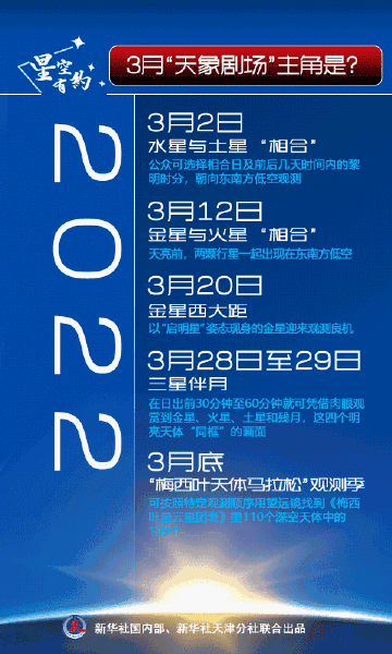 【行星唱主角!#3月天象剧场上新#】3月“天象剧场”上新啦!既有水星和土星上演的“星星相吸”,也有金星和火星带来的“二人转”,还有金星、火星和土星联袂推出的“三星伴月”。太阳系这几颗行星的表现都很亮眼,你最想观测哪一颗?(记者周润健,海报制作:冯娟)