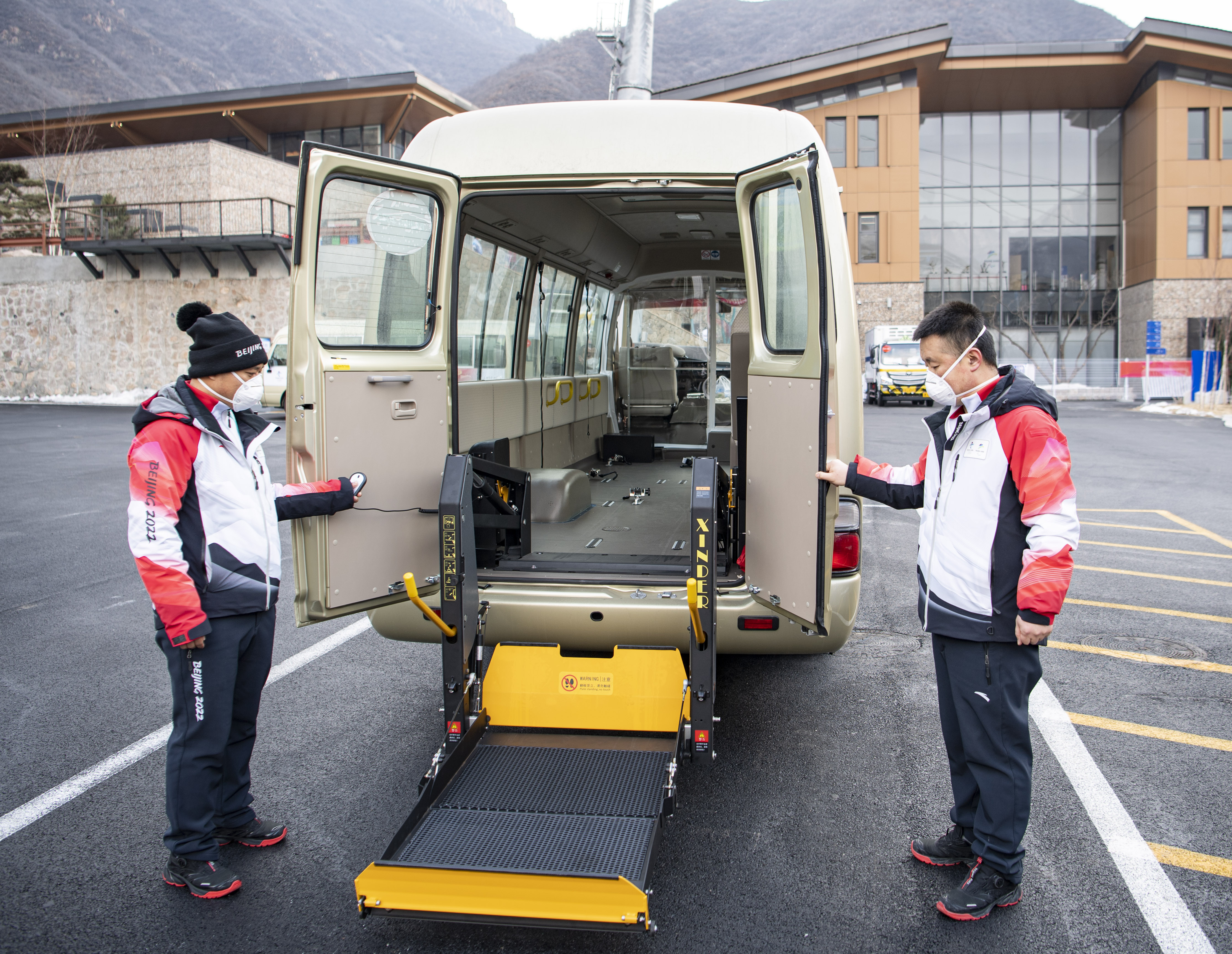 工作人员在国家高山滑雪中心展示场馆内的无障碍车辆。新华社记者孙非摄