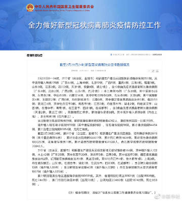 截至2月28日24时,据31个省(自治区、直辖市)和新疆生产建设兵团报告,现有确诊病例2873例(其中重症病例19例),累计治愈出院病例102017例,累计死亡病例4636例,累计报告确诊病例109526例,现有疑似病例11例。累计追踪到密切接触者1641681人,尚在医学观察的密切接触者78842人。