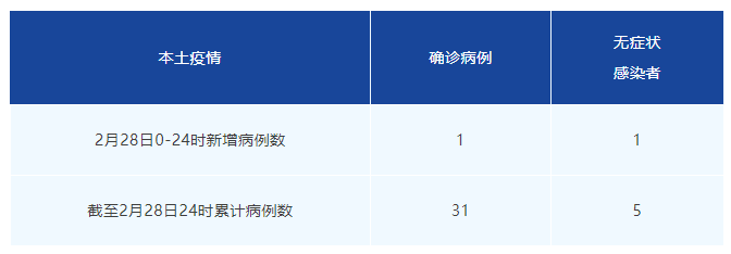 2月28日0-24时,成都市新增本土确诊病例1例,本土无症状感染者1例。截至2月28日24时,我市累计报告本土确诊病例31例,本土无症状感染者5例。