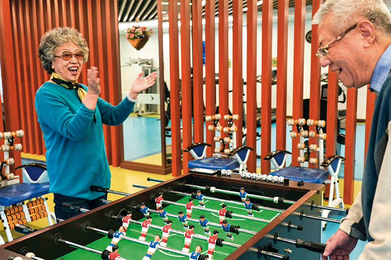 2021年10月12日,在位于河北燕郊的燕达金色年华健康养护中心活动中心内,80岁的吕伟业和老伴李战平(左)在玩桌面足球 彭子洋摄/本刊