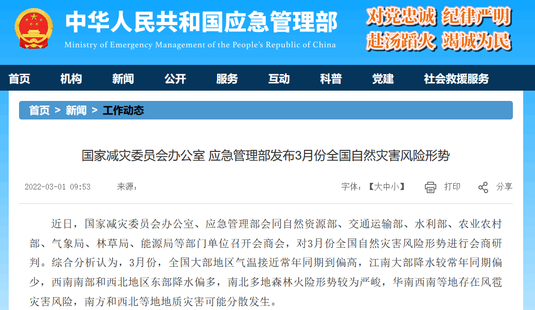 近日,国家减灾委员会办公室、应急管理部会同自然资源部、交通运输部、水利部、农业农村部、气象局、林草局、能源局等部门单位召开会商会,对3月份全国自然灾害风险形势进行会商研判。综合分析认为,3月份,全国大部地区气温接近常年同期到偏高,江南大部降水较常年同期偏少,西南南部和西北地区东部降水偏多,南北多地森林火险形势较为严峻,华南西南等地存在风雹灾害风险,南方和西北等地地质灾害可能分散发生。