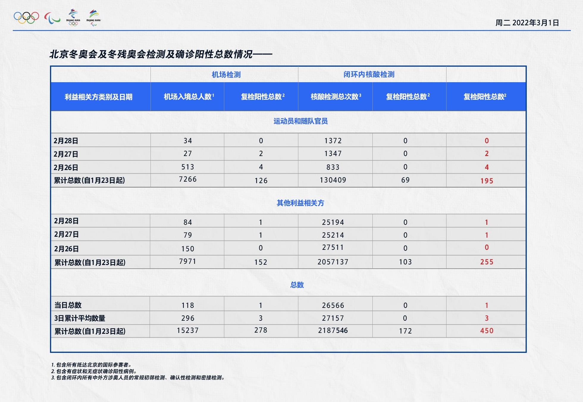 2月28日0:00至23:59,闭环内核酸检测总次数26566,其中运动员及随队官员1372,其他利益相关方25194。复检阳性0人。