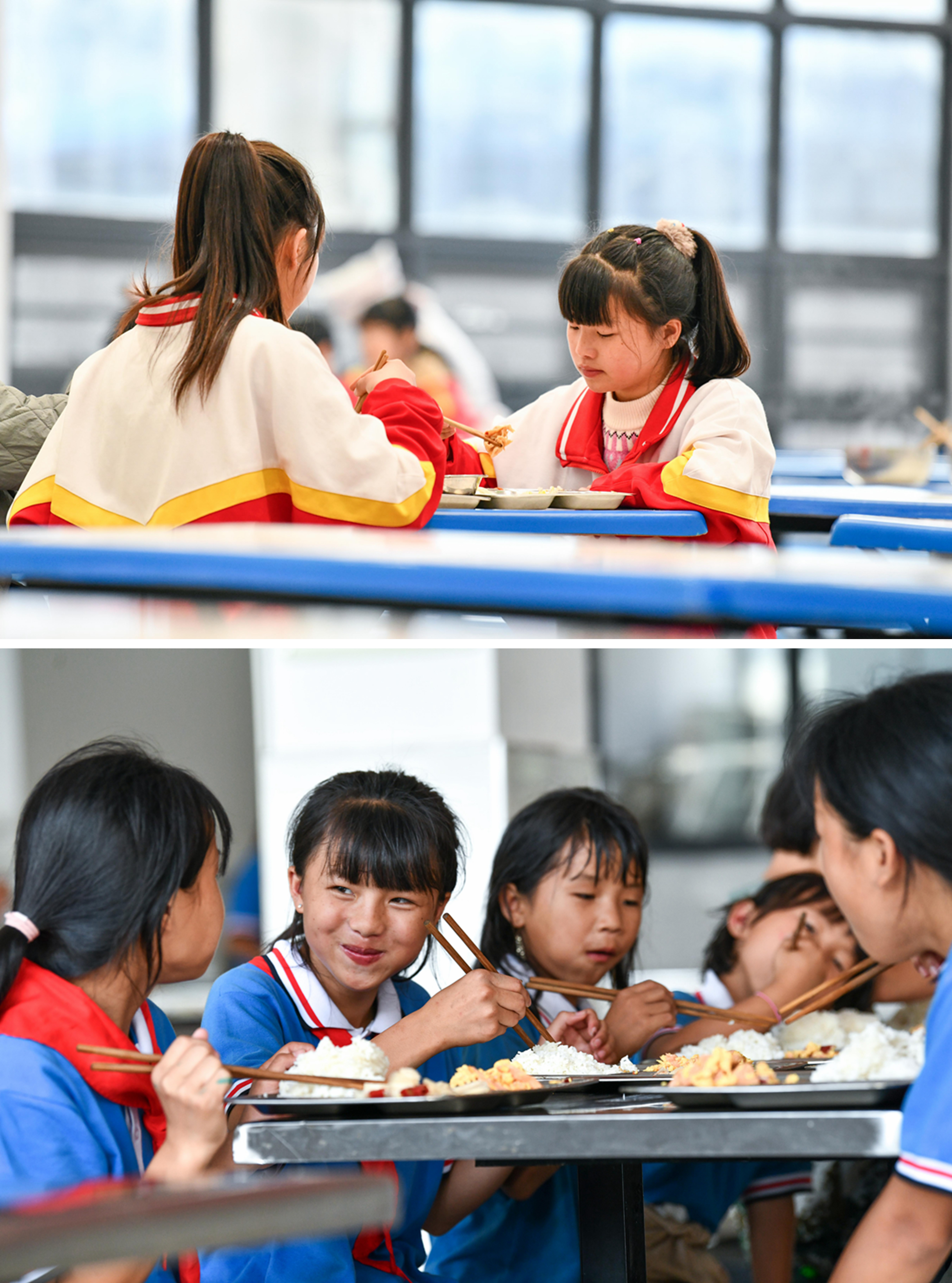新华社照片,贵州,2022年3月1日 雪菲有梦 未来可期——苗族女孩出山上学记 拼版照片:上图为潘雪菲(右)与同学在贵阳南明区李端棻中学的食堂里吃晚餐(2022年2月27日摄);下图为潘雪菲(左二)与同学们在从江县丙妹镇大歹小学食堂里吃晚餐(2021年6月24日摄)。 新学期开始,静谧了一个寒假的贵阳南明区李端棻中学再次喧闹起来。阳光透过自习室的窗户,洒在七年级学生潘雪菲和同学们身上,让人倍感温暖。 潘雪菲是来自贵州省黔东南苗族侗族自治州从江县丙妹镇大歹苗寨的苗族女孩。上小学时,因村民的观念保守,加上村里的生活条件和上学环境艰苦,潘雪菲曾一度辍学近一年时间。 近年来,潘雪菲见证了苗寨教育的变迁。随着各级各部门的倾情帮扶,大歹小学换了全新的教学楼,乡村道路全部硬化,苗寨的居住环境焕然一新,村民对女孩教育也越来越重视。2021年秋天从大歹小学毕业后,潘雪菲得到贵州省纪委监委、贵州省教育厅等部门的结对帮扶,与村里的其他9名孩子一起,来到省城贵阳上中学。 潘雪菲的梦想是做一名乡村老师。她想再回到苗寨,给山里像她一样的孩子传授文化知识,帮助他们走出大山,逐梦未来。 新华社记者 杨文斌 摄