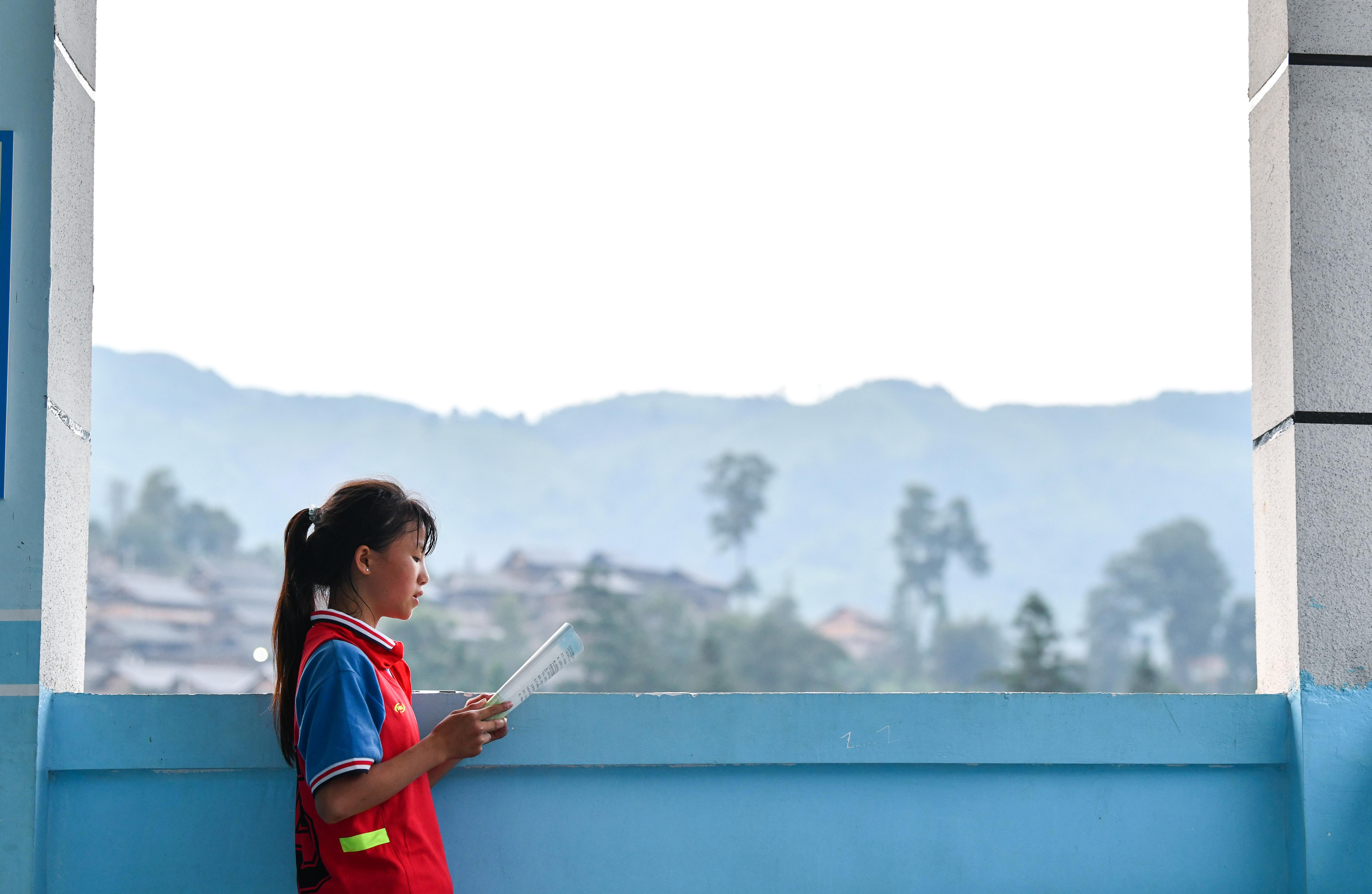新华社照片,贵州,2022年3月1日 雪菲有梦 未来可期——苗族女孩出山上学记 2021年6月24日,潘雪菲在大歹小学教室阳台上朗读课文。 新学期开始,静谧了一个寒假的贵阳南明区李端棻中学再次喧闹起来。阳光透过自习室的窗户,洒在七年级学生潘雪菲和同学们身上,让人倍感温暖。 潘雪菲是来自贵州省黔东南苗族侗族自治州从江县丙妹镇大歹苗寨的苗族女孩。上小学时,因村民的观念保守,加上村里的生活条件和上学环境艰苦,潘雪菲曾一度辍学近一年时间。 近年来,潘雪菲见证了苗寨教育的变迁。随着各级各部门的倾情帮扶,大歹小学换了全新的教学楼,乡村道路全部硬化,苗寨的居住环境焕然一新,村民对女孩教育也越来越重视。2021年秋天从大歹小学毕业后,潘雪菲得到贵州省纪委监委、贵州省教育厅等部门的结对帮扶,与村里的其他9名孩子一起,来到省城贵阳上中学。 潘雪菲的梦想是做一名乡村老师。她想再回到苗寨,给山里像她一样的孩子传授文化知识,帮助他们走出大山,逐梦未来。 新华社记者 杨文斌 摄