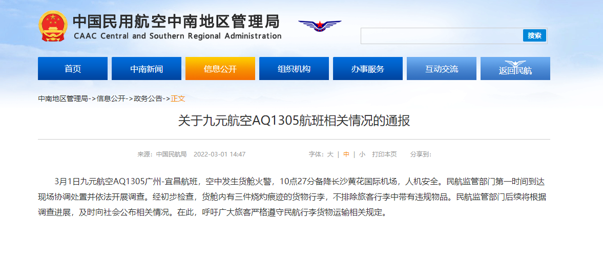 3月1日九元航空AQ1305广州-宜昌航班,空中发生货舱火警,10点27分备降长沙黄花国际机场,人机安全。民航监管部门第一时间到达现场协调处置并依法开展调查。经初步检查,货舱内有三件烧灼痕迹的货物行李,不排除旅客行李中带有违规物品。民航监管部门后续将根据调查进展,及时向社会公布相关情况。在此,呼吁广大旅客严格遵守民航行李货物运输相关规定。