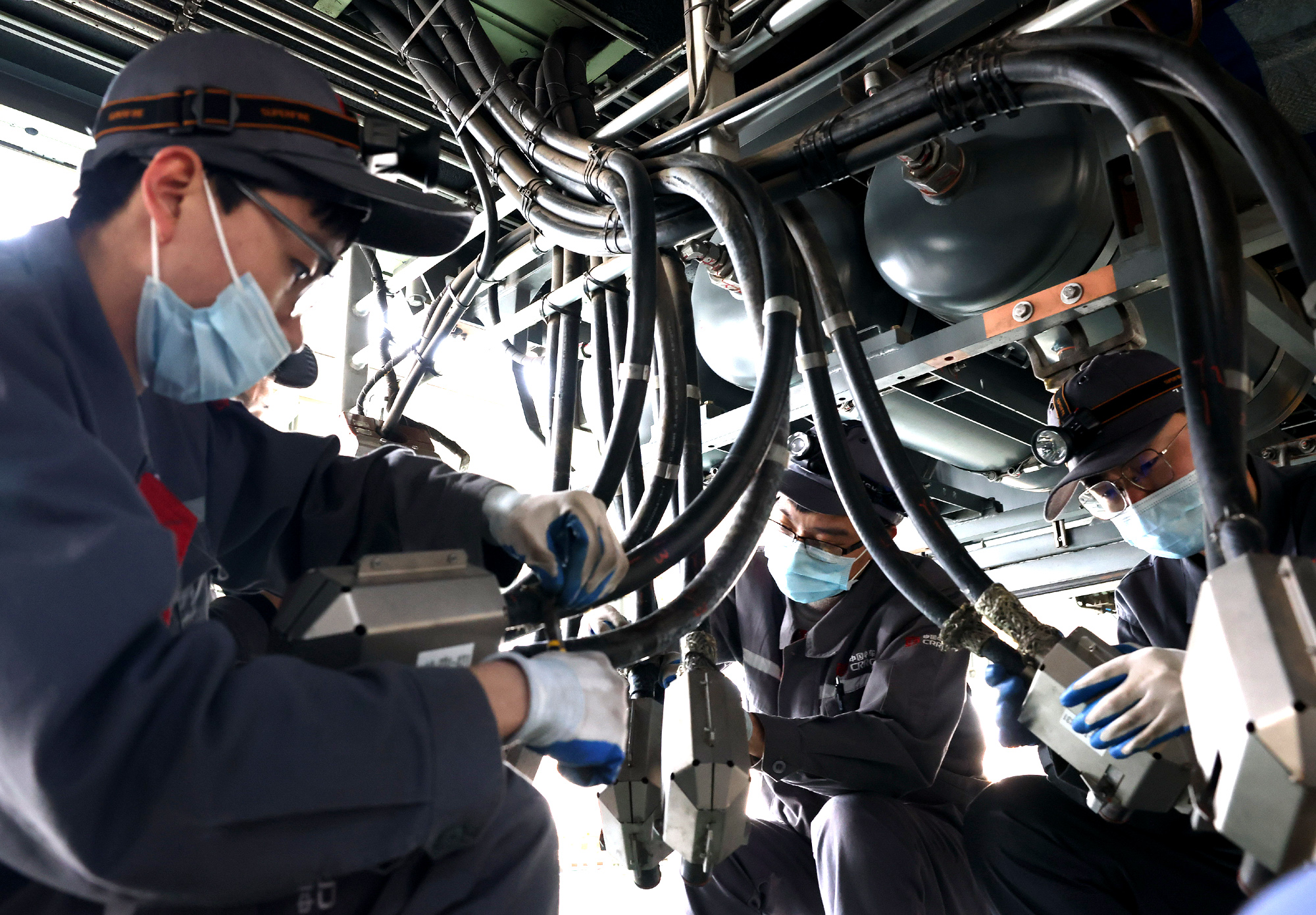 新华社照片,上海,2022年2月28日 高铁深度检修 确保安全上路 2月28日,技术人员对高铁列车牵引变流器进行检修。 随着2022年春运落下帷幕,铁路上海动车段高级场基地迎来首批6列高铁动车组进场深度检修。专业工程师和高铁检修技术人员对列车各部件进行“专家门诊”级的分解探伤和维护,确保高铁动车组不留故障隐患,再次安全上路。 新华社记者 陈飞 摄