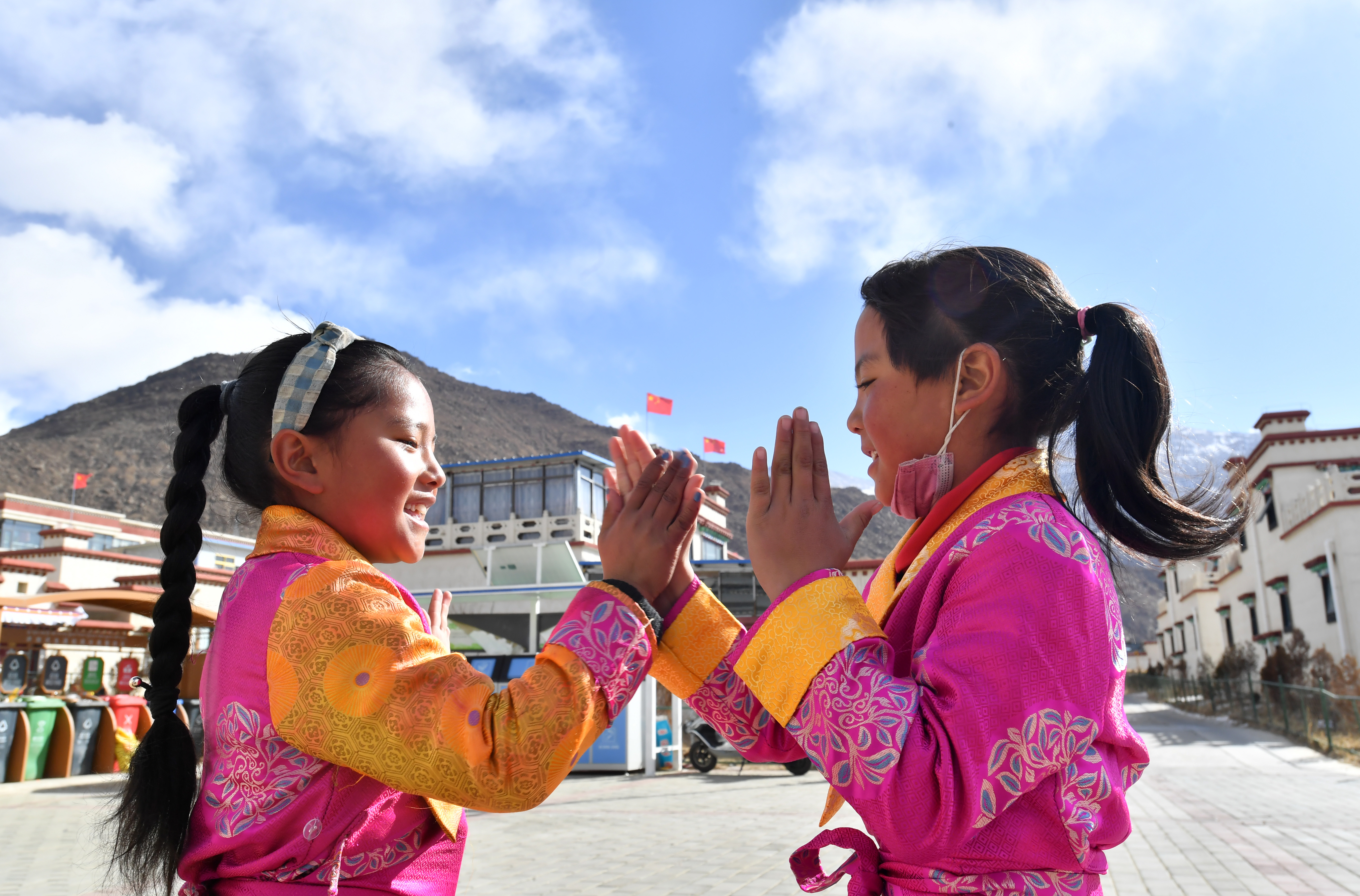 新华社照片,拉萨,2022年3月1日 搬迁牧民喜迎藏历新年 两位搬迁牧民家的小姑娘穿上盛装,在荣玛高海拔生态搬迁点做游戏(2月28日摄)。 时近藏历新年,在拉萨市堆龙德庆区古荣镇荣玛高海拔生态搬迁点,搬迁牧民们采办年货、载歌载舞,喜迎佳节。 荣玛高海拔生态搬迁点是西藏首个高海拔生态搬迁项目。为改善那曲市尼玛县荣玛乡群众生活条件,同时为羌塘国家级自然保护区内野生动物提供更多生存空间,2018年6月,政府组织千余名牧民离开平均海拔5000米的家乡,搬迁至拉萨市堆龙德庆区古荣镇荣玛高海拔生态搬迁点。266栋白墙红顶的二层楼房成为他们的新家。 海拔低了,生活也好了。2021年,荣玛高海拔生态搬迁点1268人人均收入达到19000多元。 新华社记者 觉果 摄