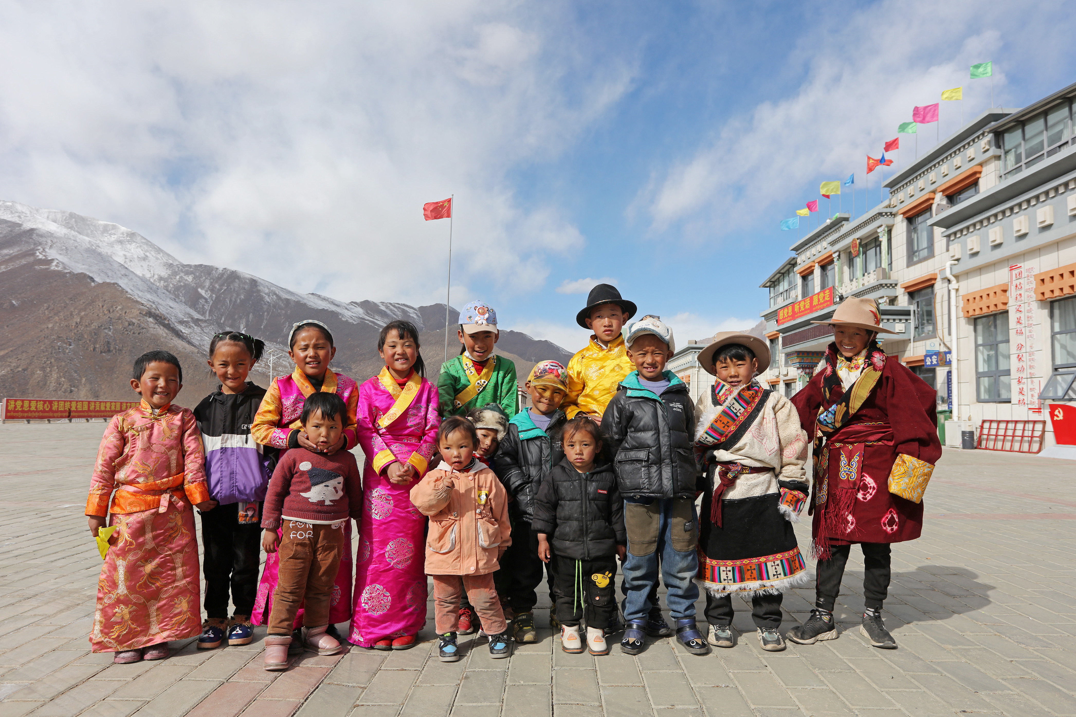 新华社照片,拉萨,2022年3月1日 搬迁牧民喜迎藏历新年 部分搬迁牧民家的孩子在搬迁点广场上合影,他们当中大一点的出生在荣玛,最小的几个出生在古荣(2月28日摄)。 时近藏历新年,在拉萨市堆龙德庆区古荣镇荣玛高海拔生态搬迁点,搬迁牧民们采办年货、载歌载舞,喜迎佳节。 荣玛高海拔生态搬迁点是西藏首个高海拔生态搬迁项目。为改善那曲市尼玛县荣玛乡群众生活条件,同时为羌塘国家级自然保护区内野生动物提供更多生存空间,2018年6月,政府组织千余名牧民离开平均海拔5000米的家乡,搬迁至拉萨市堆龙德庆区古荣镇荣玛高海拔生态搬迁点。266栋白墙红顶的二层楼房成为他们的新家。 海拔低了,生活也好了。2021年,荣玛高海拔生态搬迁点1268人人均收入达到19000多元。 新华社记者 姜帆 摄