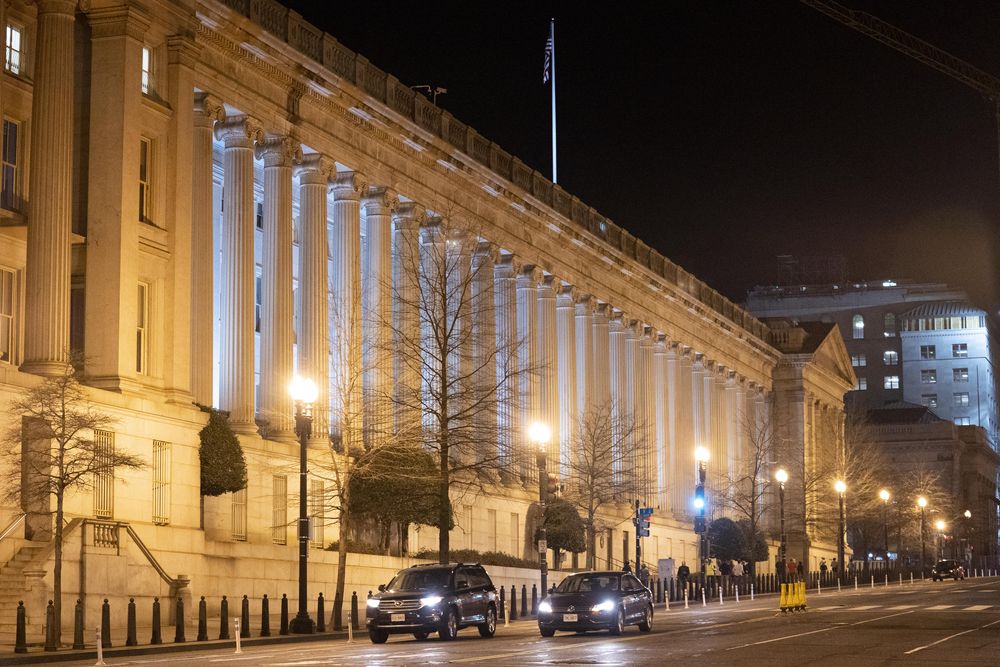 这是2月28日在美国首都华盛顿拍摄的美国财政部大楼。(新华社记者刘杰摄)